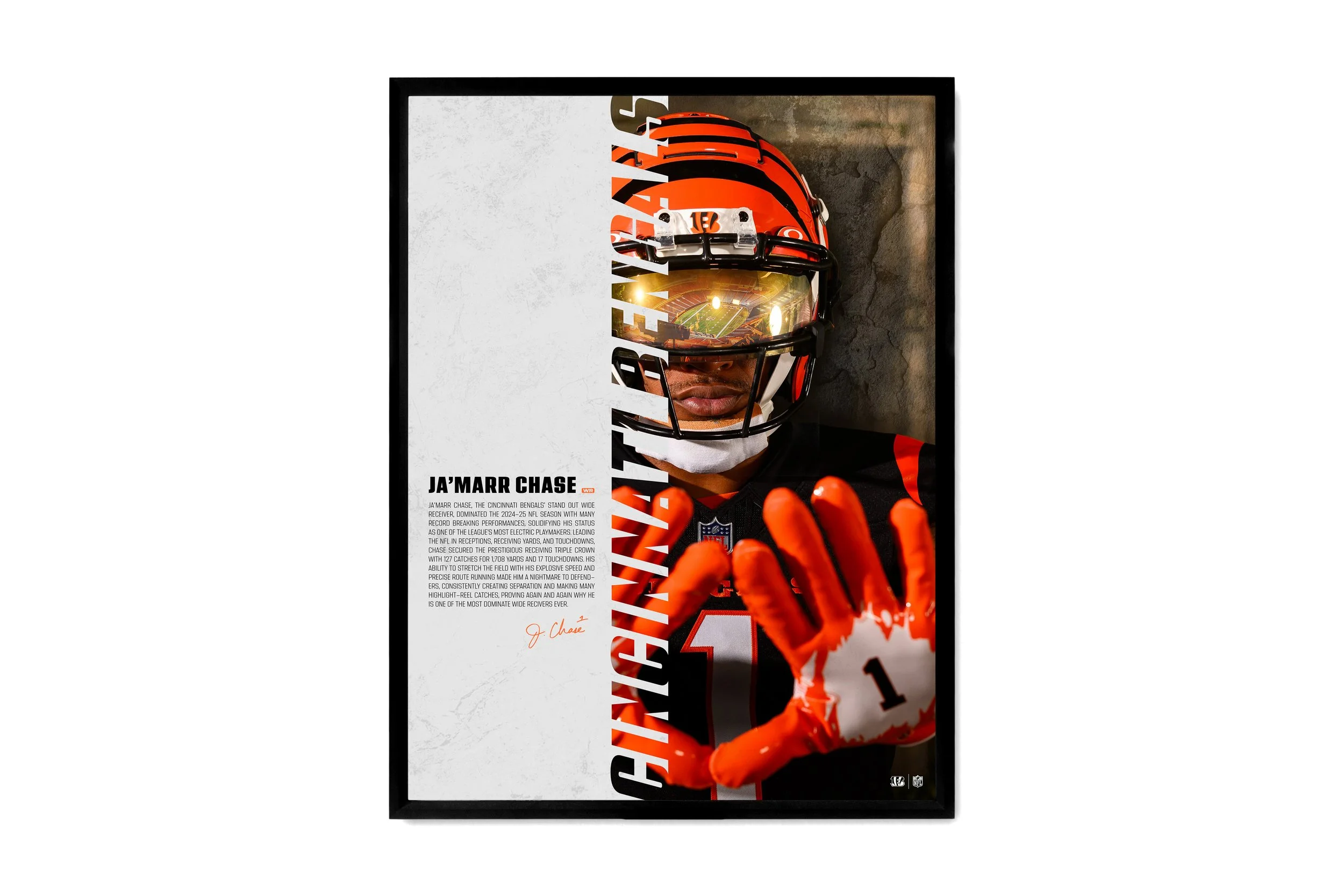 This poster captures the intensity and dominance of Ja'Marr Chase, blending bold typography, dynamic photography, and structured composition. The split design creates a striking contrast between the clean, text-focused left side and the powerful imagery on the right, emphasizing his presence and impact on the field.