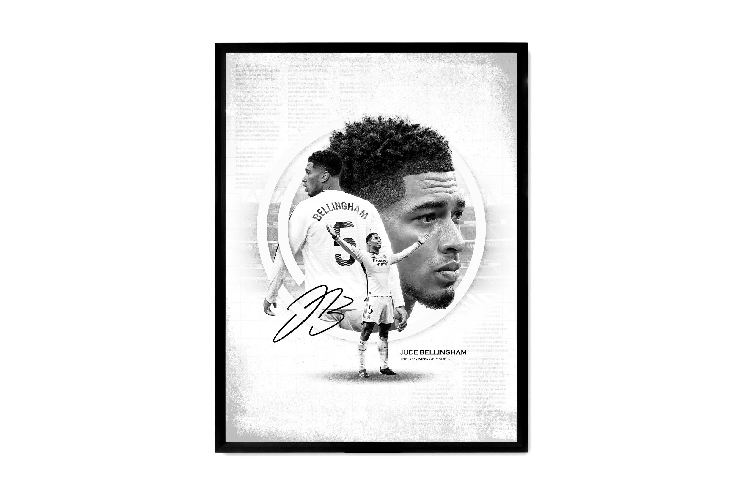 This poster celebrates Jude Bellingham and his rise as a dominant force in soccer. The black-and-white color scheme, inspired by Real Madrid’s iconic kit, gives the design a timeless feel. The circular framing, drawn from the Real Madrid logo, reinforces his connection to the club while adding depth and structure to the composition. Titled "The New King of Madrid," this piece captures his impact on the sport and the bright future he has with Real Madrid.
