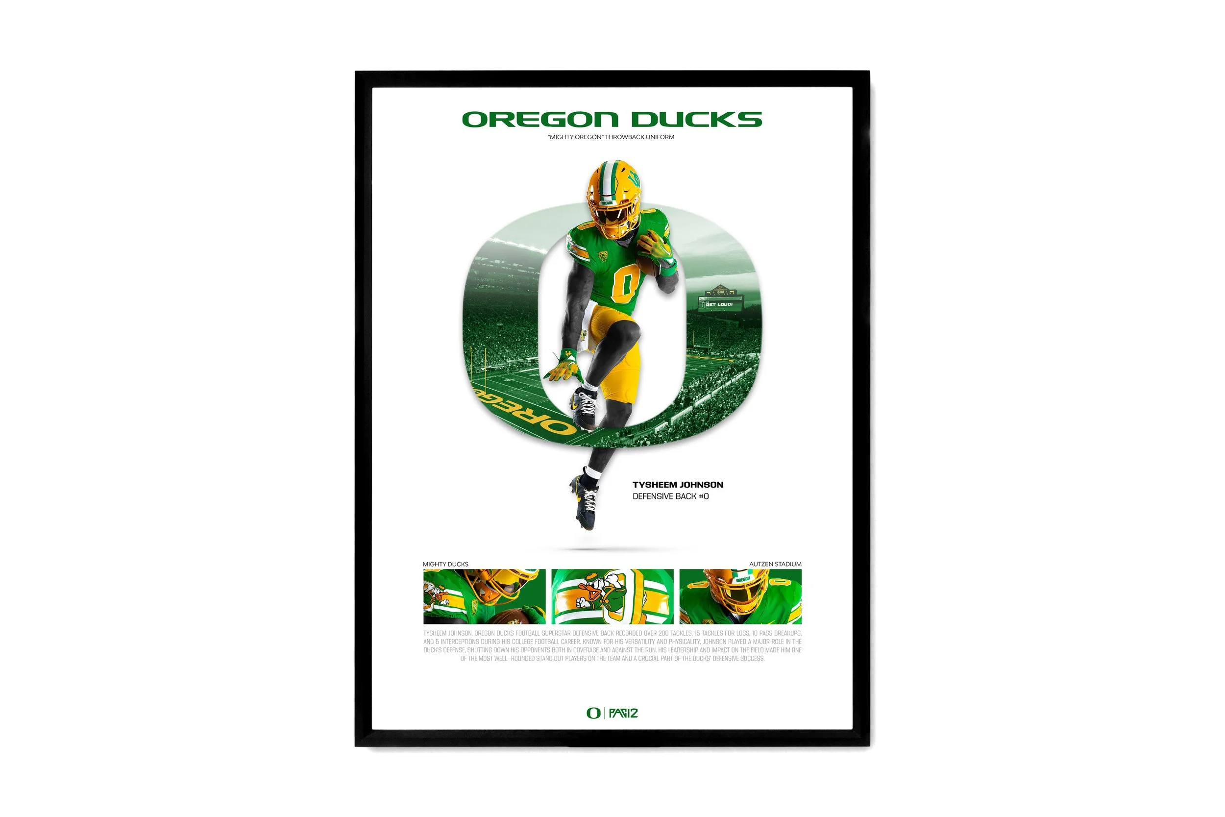 This poster highlights Tysheem Johnson, a defensive back for the Oregon Ducks. He’s placed within the iconic Oregon "O," with the atmosphere of Autzen Stadium to emphasize his presence on the field. The "Mighty Oregon" throwback uniform adds a nostalgic touch, paying tribute to the team’s rich history.